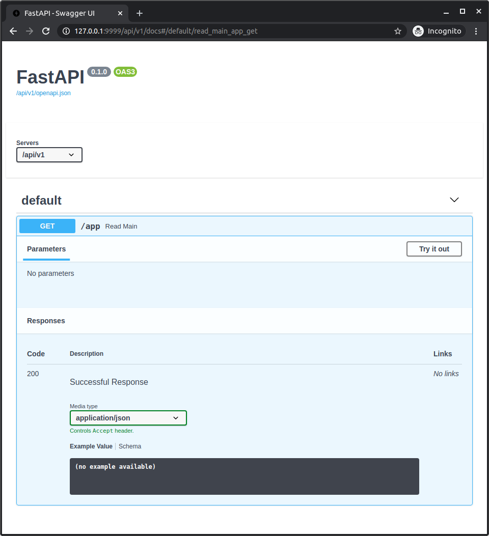 Notice the auto-generated server with a url value of /api/v1, taken from the root_path.